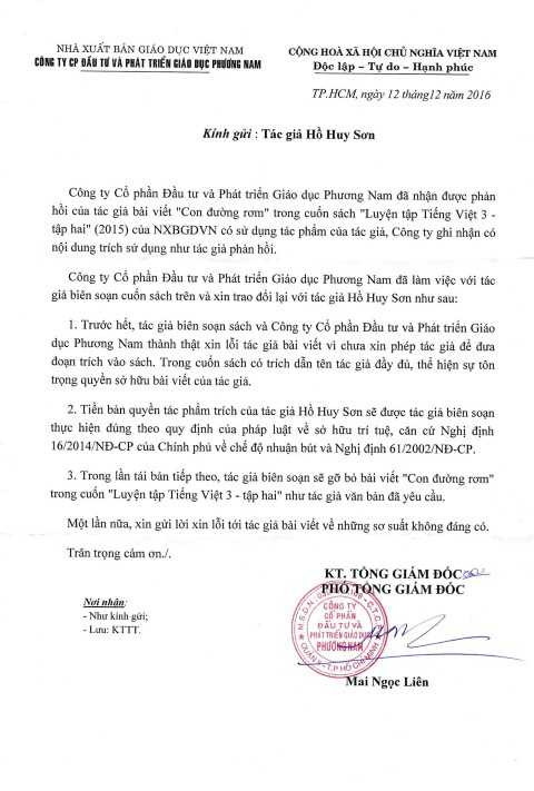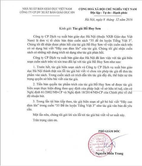 Hai thư xin lỗi của NXB GDVN gửi tới nhà văn Hồ Huy Sơn