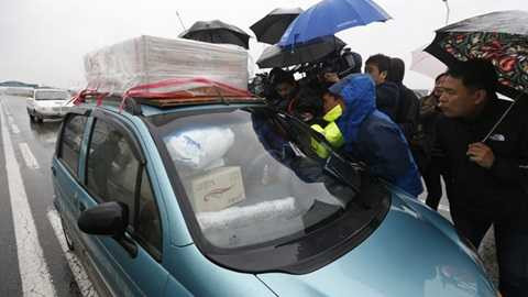 | Dù trời mưa, cánh nhà báo vẫn đeo bám ở khu phi quân sự tại Paju. Họ tranh thủ phỏng vấn những người Hàn Quốc chở hàng hóa sản xuất từ Khu công nghiệp Kaesong trên đất Triều Tiên về phía nam hôm 6/4 - Ảnh: Reuters/ Tuổi Trẻ |