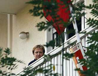 Một phụ nữ chưa được xác định đang đứng ở ban công tòa đại sứ Thụy Sỹ tại Athens (ảnh: Reuters).