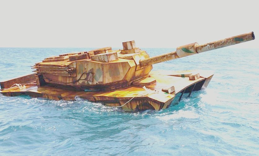 Bức ảnh cho thấy chiếc xe tăng với tháp pháo và nòng súng trôi nổi trên biển.