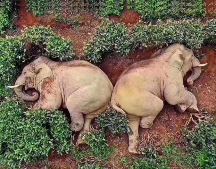 Bức ảnh lũ voi say xỉn nằm ngủ gục giữa cánh đồng chè được chia sè trên Weibo và có tới hơn 140.000 lượt thích. Dân làng cho biết cặp voi này là 2 trong 14 con voi đột nhập vào ngôi làng.