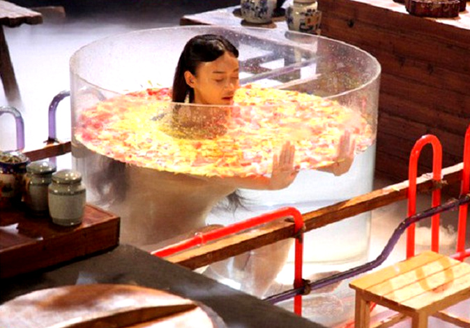 Cảnh tắm của Thẩm Mộng Thần trong một bộ phim cổ trang. Hình ảnh hậu trường được cô tiết lộ cho thấy nữ diễn viên mặc đồ bảo hộ đến tận vai, bồn tắm không có nước.