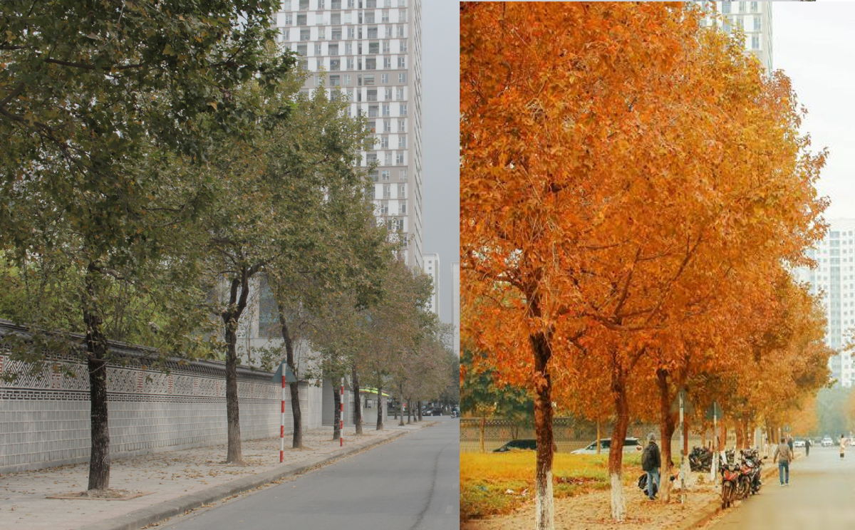 Lá cây chuyển màu chỉ hơi ngả vàng, không đỏ như trên ảnh.
