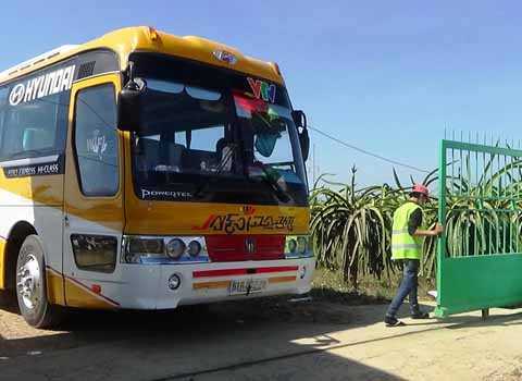 Chiếc xe khách có logo VTV trước đầu xe, chở hàng chục người lạ mặt thả xuống khu vực gần trang trại thanh long của Công ty Hồng Ân vào rạng sáng 29/1.