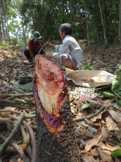 Giây lát sau, một người trong số họ bất ngờ vung con dao đi rừng bén ngót phạt ngang thân dây. Tức thì, một dòng nhựa đỏ như máu ứa ra. Cả nhóm cùng reo lên mừng rỡ: “Đúng nó rồi” và lập tức chặt hết cụm dây leo xuống, cắt thành từng đoạn dài 50 cm, dùng một miếng ni lông mỏng bịt chặt các đầu thân dây đang “ứa máu” lại.