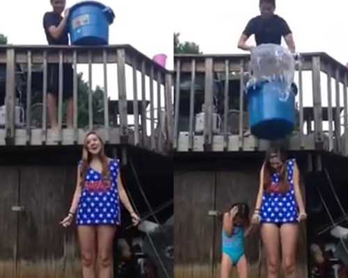 | Xô nước lớn rơi thẳng xuống phần sau đầu và lưng cô gái. |