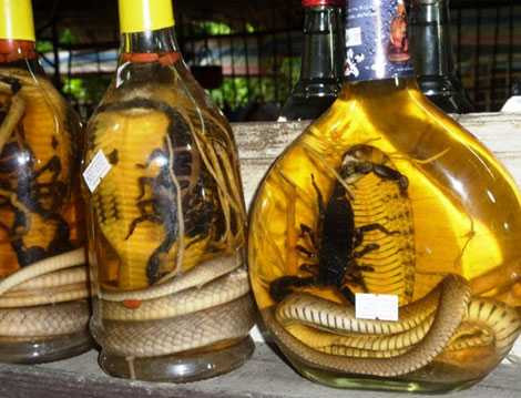 Rượu ngâm côn trùng được quảng cáo có tác dụng cường dương kỳ diệu: Mối chúa ngâm rượu khi uống vào có tác dụng kéo dài thời gian "gần gũi"; bọ cạp sẽ làm quên cảm giác "mỏi gối chồn chân"; rồi rết, nhện núi, tắc kè, rắn lục…