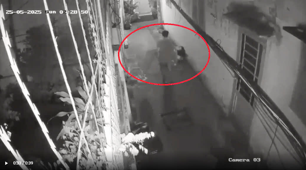 Camera an ninh ghi lại cảnh Nguyễn Ngọc C. mang thi thể mẹ quấn trong chăn, mền, vứt ra đường lúc rạng sáng. (Ảnh: Người dân cung cấp)