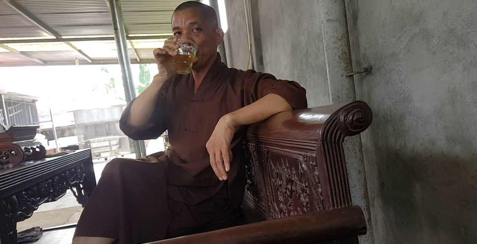 Trong khi trả lời phóng viên báo chí, sư thầy Thích Bản Phúc vừa nói chuyện vừa uống bia.