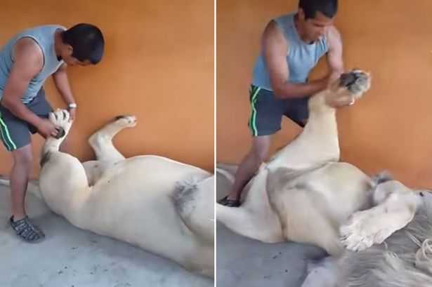 Sư tử ngoan ngoãn nằm im cho chàng trai mát-xa chân