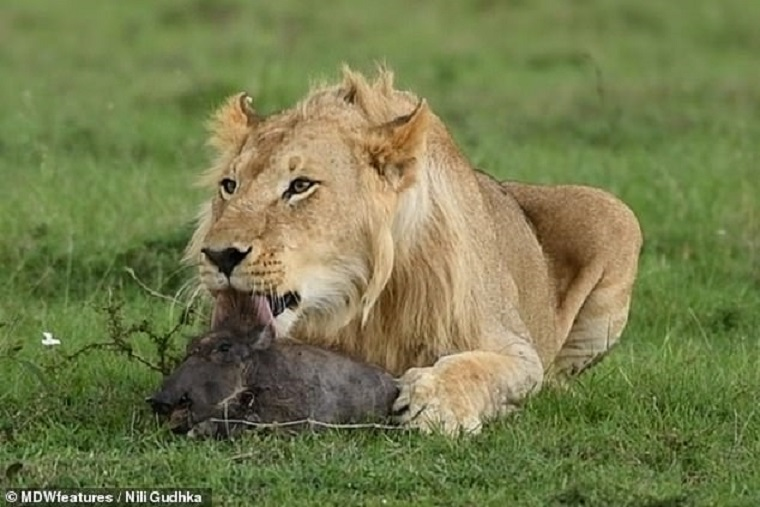 Sau khi hết hứng với chuyện vờn con mồi, sư tử cắn chết con lợn trước khi xé xác nó. Lợn mẹ chỉ dám quan sát cảnh tượng đau lòng này từ xa mà không dám lại gần.