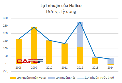 | Lợi nhuận năm 2012 của Halico tăng đột biến nhờ khoản tiền đền bù di dời nhà xưởng. Số liệu 2014 chỉ bao gồm riêng công ty mẹ. |