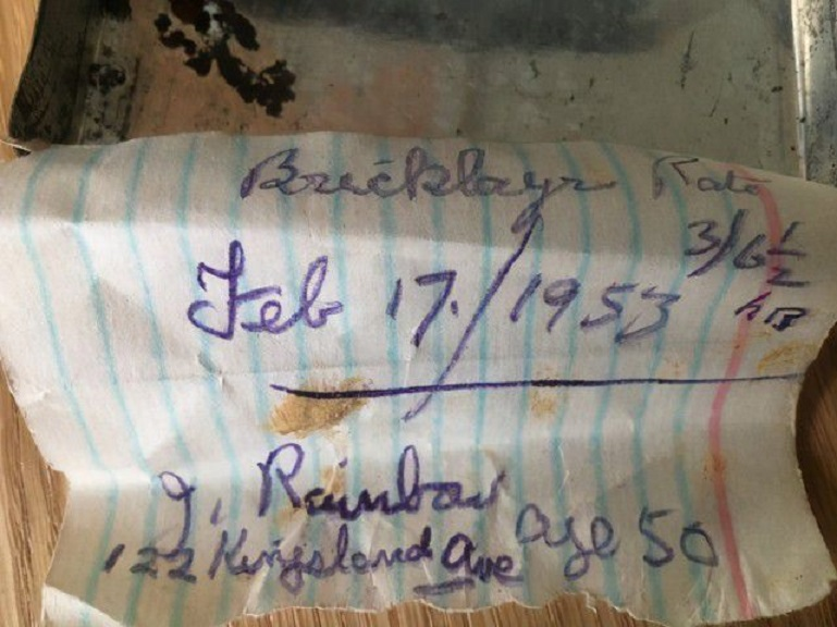 "Phí thợ nề 3/6 ½, ngày 17/2/1953, John Reinbo, tại 122 Đại lộ Kingsland, tuổi 50", tờ giấy viết.