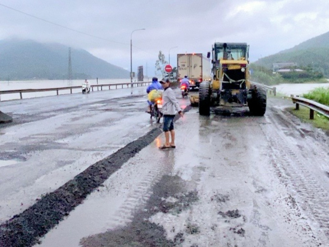Sau những trận mưa lớn kéo dài, tại vị trí km1349-km1350, địa phận cầu Cây Tra (thị xã Đông Hòa, Phú Yên), xuất hiện dày đặc “ổ voi”, “ổ gà” chi chít trên mặt đường. Nhiều vị trí bị bong tróc tạo nên các “ổ gà” với đường kính từ 20 - 30 cm.