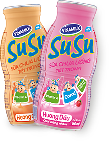 | Sữa chua uống SuSu có dạng chai màng nhôm (80ml), chai nắp vặn (80ml), hộp giấy Tetra (100ml) và hộp giấy Combi (110ml). |