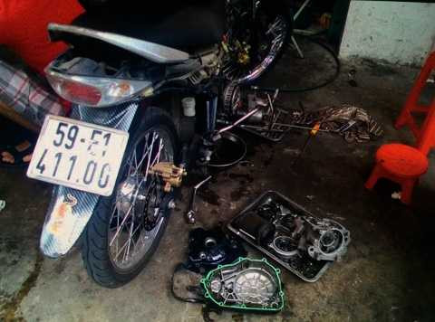 | Xe máy của hiệp sỹ Minh Tiến lúc còn sửa tại tiệm sửa xe quận Tân Phú |