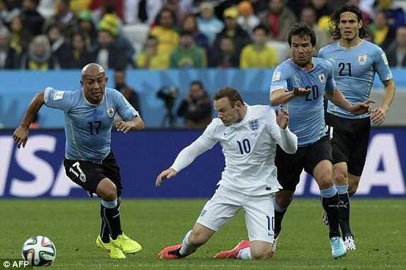 32' BÓNG CHẠM XÀ NGANG. Rooney lẳng lặng lẻn ra sau hàng phòng ngự Uruguay, bật cao đánh đầu nhưng do ở cự li gần, bóng lại bay trúng xà ngang. Cũng phải thừa nhận, pha sút phạt mà Gerrard thực hiện rất hay, bóng đi cong liệng, loại bỏ toàn bộ phán đoán từ những cái bóng áo xanh.