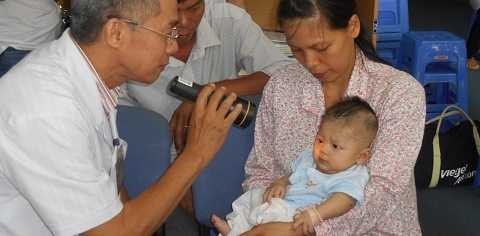 | Bác sỹ chuyên khoa mắt khám hoạt động mắt bé Phát. Ảnh: Phan Cường |