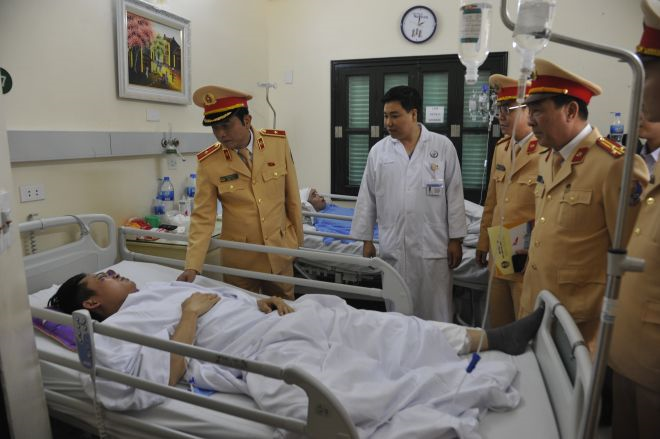 Thiếu tướng Trần Quốc Trung, Phó Cục trưởng Cục cảnh sát giao thông cùng đoàn công tác Cục CSGT đến Bệnh viện Việt Đức thăm hỏi, động viên Trung úy Lê Tất Lâm. (Ảnh Cục CSGT)
