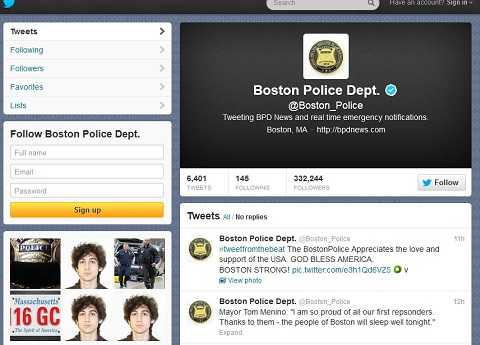 Kể từ sau vụ nổ súng ở trường công nghệ Massachusetts khiến 1 cảnh sát thiệt mạng và cuộc truy lùng nghi phạm đánh bom giải marathon Boston bắt đầu, cảnh sát thành phố này đã sử dụng mạng Twitter để thông báo các thông tin quan trọng cho người dân. Ban đầu là tấm ảnh của nghi phạm Dzhokhar Tsarnaev được đưa lên, sau đó là yêu cầu cư dân thành phố đóng kín cửa và ở yên trong nhà để phục vụ cho công việc của cảnh sát.