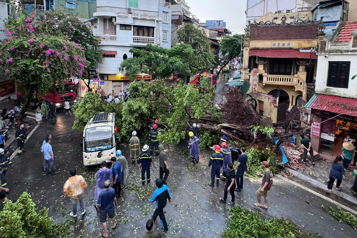 Cây cổ thụ đổ tại ngã tư Hàng Cá - Chả Cá (Hà Nội) đổ do ảnh hưởng của bão số 3.