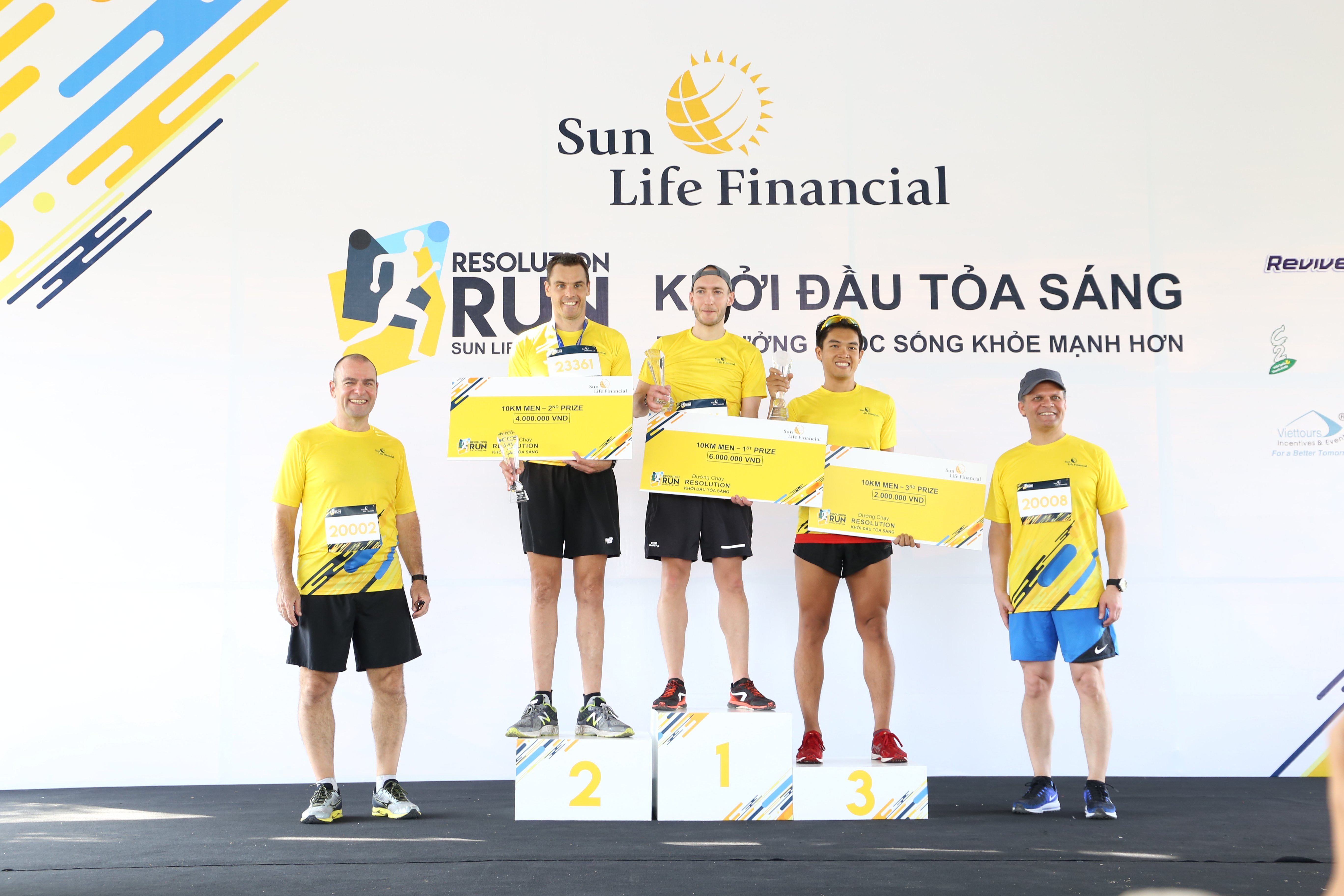 Ông Claude Accum - Chủ tịch Sun Life Financial châu Á và ông Larry Madge - Tổng giám đốc Sun Life Việt Nam trao cup & séc giải thưởng cho các người thắng cuộc cự ly 10 Km nam