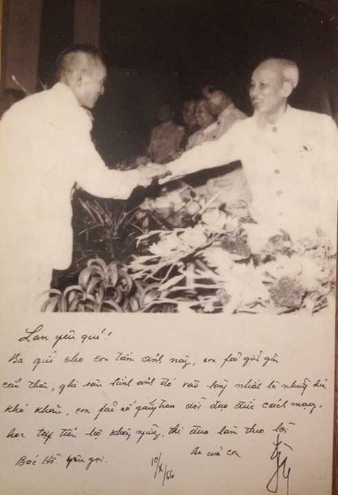 Bức ảnh quý Bác Hồ bắt tay nhạc sĩ Đinh Ngọc Liên và những dòng thư nhạc sĩ viết dặn dò con gái Tuyết Lan.