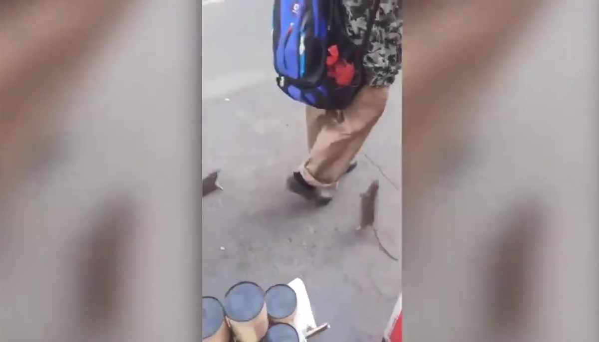 Cảnh 2 chú chuột được người đàn ông dắt đi dạo trên phố như thú cưng ắt hẳn khiến những người chứng kiến phải "mắt chữ o, mồm chữ a".