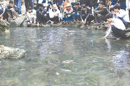 May mắn là trong chuyến đi hôm ấy, chúng tôi đã gặp ông Hà Văn Thân, người dân tộc Mường, sống tại thôn Chiềng Ban. Ông cũng chính là người được cử trông coi suối cá và ban thờ trên núi. Thấy chúng tôi có vẻ băn khoăn, khi trông xuống dòng nước, ông Thân như hiểu ý. “Các cậu muốn thấy cá, thì phải làm thế này này”, nói rồi, ông vỗ nhẹ hai bàn tay và rắc xuống mặt nước một ít bột, giống như cám ngô. Bất ngờ, một đàn cá lớn, lưng đen lao đến, vây kín mặt nước trước sự sững sờ của chúng tôi.