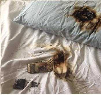 | Ảnh chiếc điện thoại cháy, khiến gối và ga giường bị ảnh hưởng. |