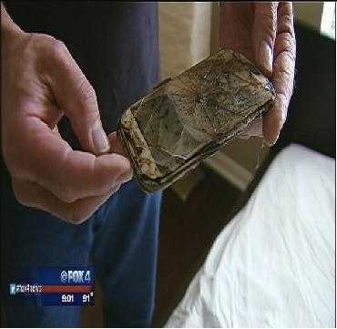 | Người cha đưa chiếc điện thoại bị cháy cho phóng viên Fox4 xem. |