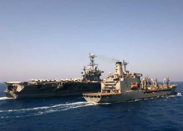 | Một trong bốn tàu khu trục của Mỹ (trái) triển khai sẵn ở Địa Trung Hải |