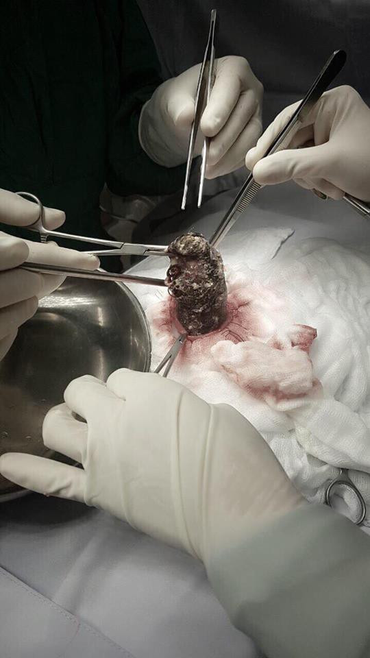 Trước đó, bệnh viện tiếp nhận bé P. trong tình trạng đau bụng từng cơn, ói dịch xanh và đồ ăn cũ, bụng phình to. Sau khi kiểm tra lâm sàng, các bác sỹ phát hiện ở dạ dày của bé có 1 búi tóc rất to, làm tắc nghẽn toàn bộ đường thoát dạ dày xuống ruột non. Ngay lập tức, bệnh nhân được đưa lên phòng mổ và các bác sỹ đã lấy ra 1 búi tóc nặng 1kg trong dạ dày.