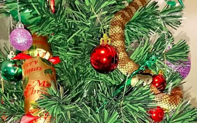 Con rắn hổ quấn quanh cây thông Giáng sinh dễ gây nhầm lẫn với một sợi dây kim tuyến