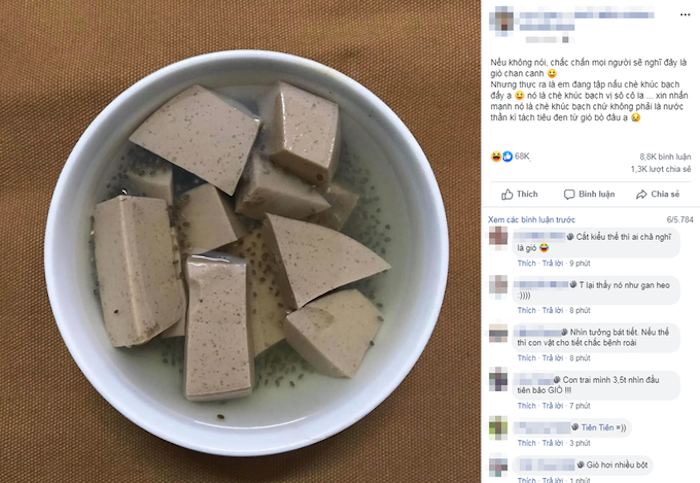 Đăng tải bức hình trên lên mạng xã hội, chủ nhân món ăn giải thích: "Nếu không nói chắc chắn mọi người sẽ nghĩ đây là giò chan canh, nhưng thực ra em đang tập nấu chè khúc bạch đấy ạ. Nó là chè khúc bạch vị socola. Xin nhấn mạnh là chè khúc bạch chứ không phải nước thần kỳ tách tiêu đen từ giò bò đâu ạ".