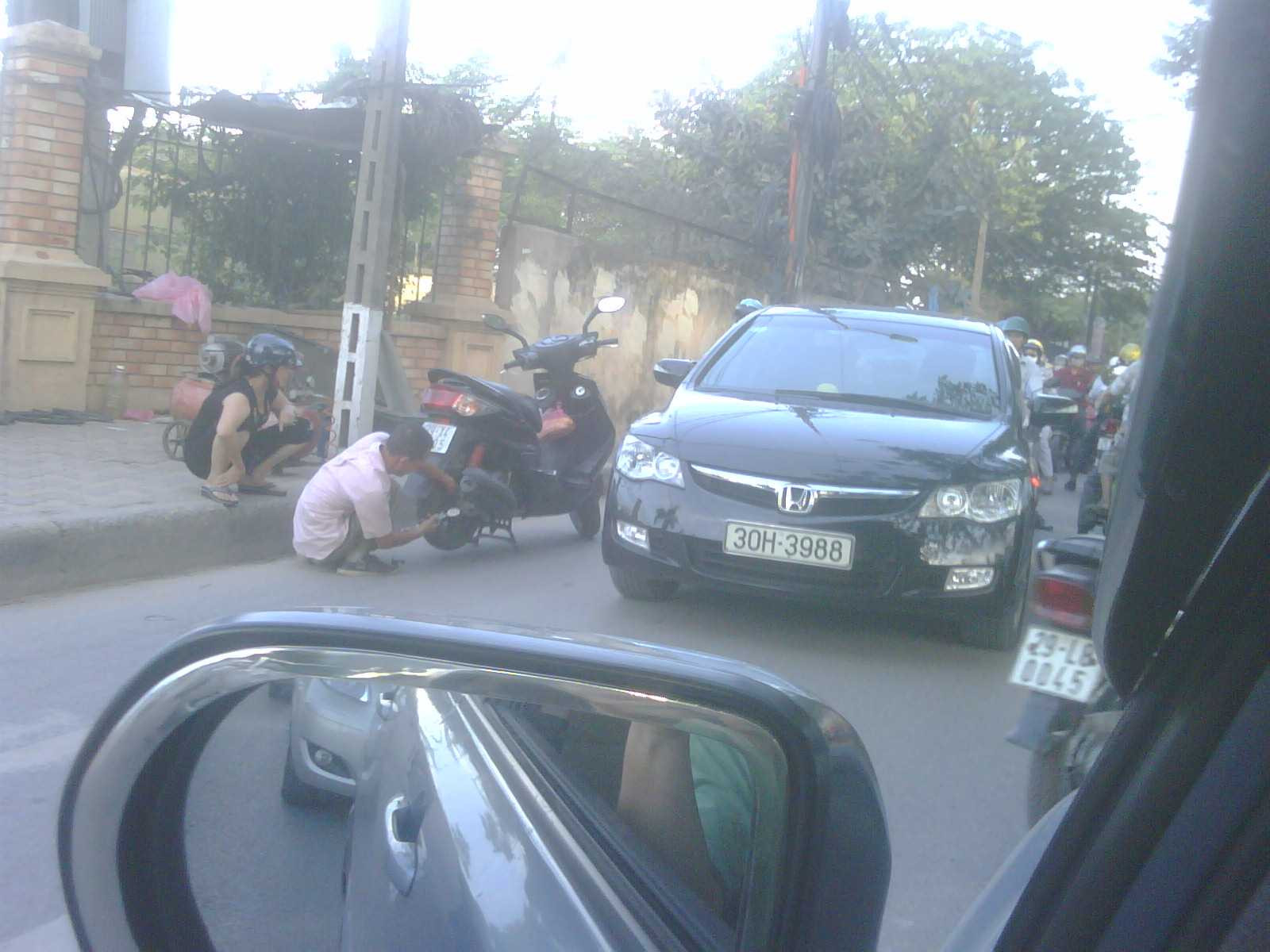 Người thợ sửa xe này thản nhiên làm việc dưới lòng đường không chút vội vã, không quan tâm đến việc mình đang gây tắc đường trong giờ cao điểm. Ảnh chụp tại đầu đường Lê Trọng Tấn hồi 5h10 ngày 14 tháng 6 2010.