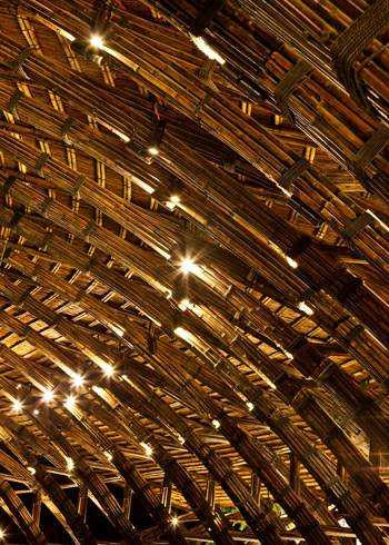 | Cận cảnh phần áp mái công trình với những nhịp tre uốn lượn công phu. |