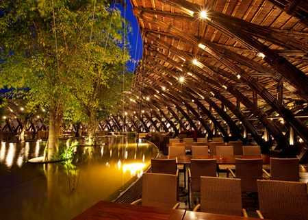 Tác phẩm mang đậm chất Việt với vật liệu tre tầm vông, 41 khung tre tạo thành một hình bán khuyên ôm trọn hồ nước cảnh quan làm thành 1.000 m2 nhà hàng và sân khấu nổi trên mặt nước hồ.