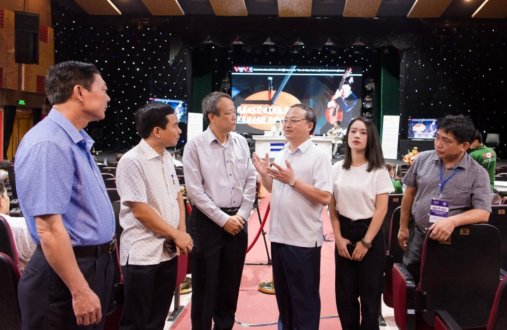 Tổng Giám đốc VOV Đỗ Tiến Sỹ và Giám đốc VOH Lê Công Đồng kiểm tra công tác kỹ thuật phục vụ thi Phát thanh trực tiếp.