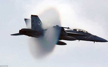 | Hiệu ứng 'rào cản âm thanh' sinh ra khi máy bay bắt đầu vượt ngưỡng tốc độ âm thanh và rất ngắn nên ít khi thấy được trong các video |