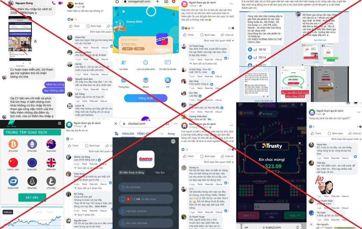 Nhiều vụ lừa đảo trực tuyến từ cộng tác viên online sàn giao dịch điện tử đến đầu tư chứng khoán, tiền số... được ghi nhận từ cuối năm 2023 đến đầu năm 2024. (Ảnh chụp màn hình)