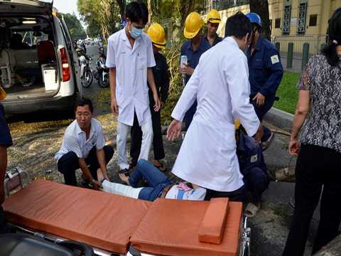 Chị Ngô Hoàng Như Thủy bị gãy chân được các bác sĩ sơ cứu tại chỗ