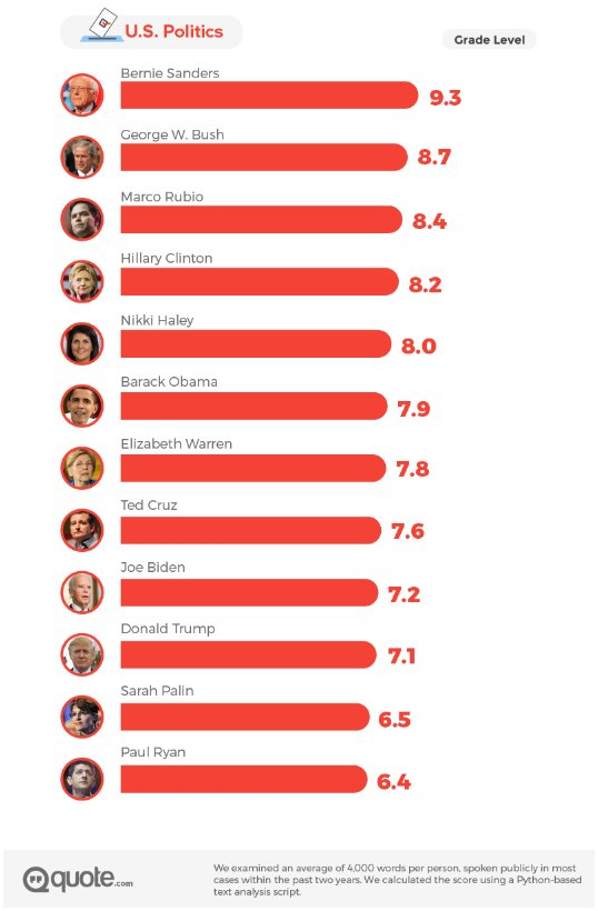 Trong số các ứng viên Tổng thống của mùa bầu cử 2016, cựu ứng viên đảng Dân chủ Bernie Sanders là người có số điểm cao nhất, với tài hùng biện xếp ở cấp độ 9. Marco Rubio theo sát ở vị trí thứ 2, nằm giữa khoảng cấp độ 8 đến 9.