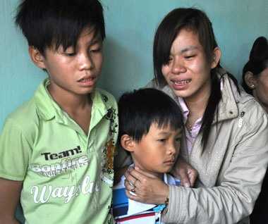 | Nguyễn Thành Tâm(14 tuổi) và Nguyễn Thành Trung (10 tuổi) ngơ ngác bên thi thể mẹ là Đặng Thị Thơm. |