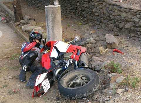 | Sau khi cán qua người VĐV mô tô, thanh niên lái mô tô PKL tông thẳng vào trụ điện. Ảnh Dư Hải |