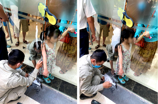 Tuy nhiên cô bé khá bình tĩnh, không hoảng sợ, la khóc, tay trái của bé bám vào một người phụ nữ. Đội ngũ cứu hộ đã nhanh chóng có mặt để tháo cánh cửa kính, giải cứu em bé này. Được biết, sự việc diễn ra tại sảnh của một căn hộ chung cư cao cấp ở Hà Nội.