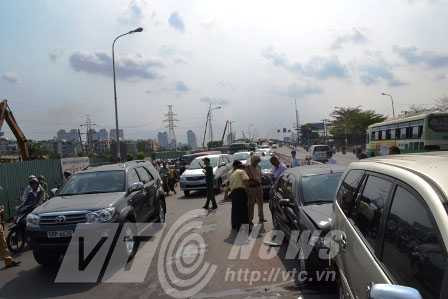 Tai nạn khiến giao thông qua cầu Sài Gòn bị ùn tắc nghiêm trọng. Lực lượng CSGT quận 2 phải có mặt để xử lý vụ việc phân luồng điều tiết giao thông.