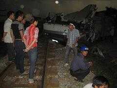 Không dừng lại ở đó, xe tải 37S còn tiếp tục bẻ lái bay qua tuyến đường sắt Bắc - Nam khiến 4 thanh ray đoạn Km 267+720 cong vênh, hàng chục thanh tà vẹt bị lệch. Hậu quả, tài xế Toàn phải đưa đi bệnh viện cấp cứu trong tình trạng nguy kịch, đầu xe tải 37S nát bét hoàn toàn.