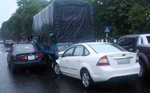 Khi đến đoạn đường đối diện số nhà 140 Nguyễn Tri Phương, do trời mưa to, thiếu quan sát, xe tải bất ngờ rẽ trái và tông vào xe Camry đang lưu thông bên cạnh. Cú va chạm khiến cả 2 xe mắc kẹt vào nhau, xe Camry BKS 69H-4348 thì bị hư hỏng nặng ở phần hông và đuôi.