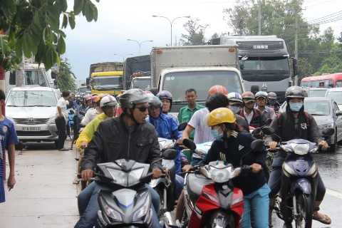 Các phương tiện bị hư hỏng nằm chắn ngang đường khiến giao thông bị tắc nghẽn nhiều giờ liền, lực lượng CSGT Công an Thuận An đã nhanh chóng tới hiện trường, điều tiết giao thông.